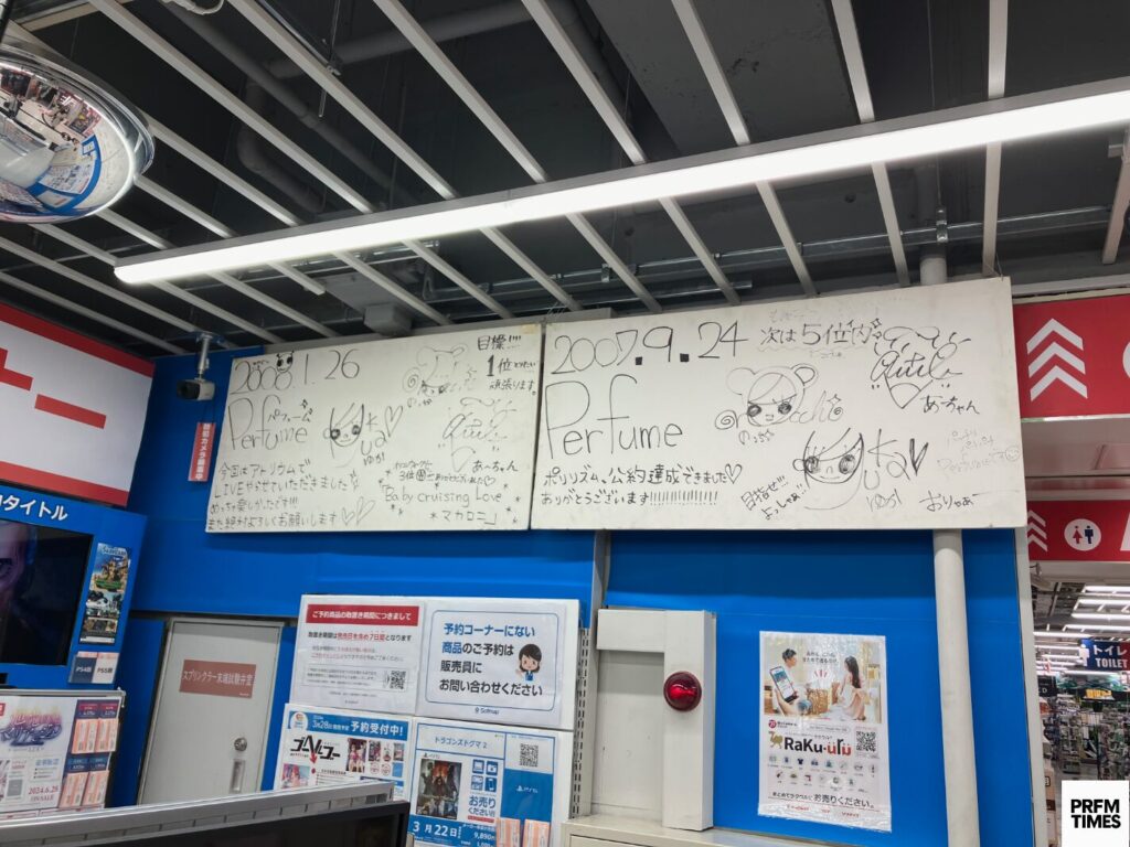 Perfumeメンバーのサイン等の展示があるお店などです。