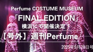 Breaking News 【号外】「Perfume COSTUME MUSEUM FINAL EDITION」横浜・そごう美術館にて開催決定! 2023年から全国5都市で開催されてきたPerfumeの大規模衣裳展「Perfume COSTUME MUSEUM」。その「FINAL EDITION」が、横浜・そごう美術館で開催決定です!これを執筆している9月28日(日)をもって、岩手県... 2025.09.28 Breaking News週刊Perfume